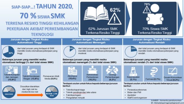Perkembangan teknologi yang semakin pesat dengan otomatisasi yang semakin tinggi tentu akan mengeser peran manusia dan digantikan oleh mesin. Lulusan SMK ternyata mendapat hantaman yang sangat besar akibat kondisi ini, diramalkan hampir 70% siswa lulusan SMK akan kehilangan pekerjaan (resiko tinggi otomatisasi). Pemerintah harus segera menyikapi kondisi ini dengan melakukan Rekontruksi kebijakan vokasi untuk menghidari nyatanya ramalan ini.