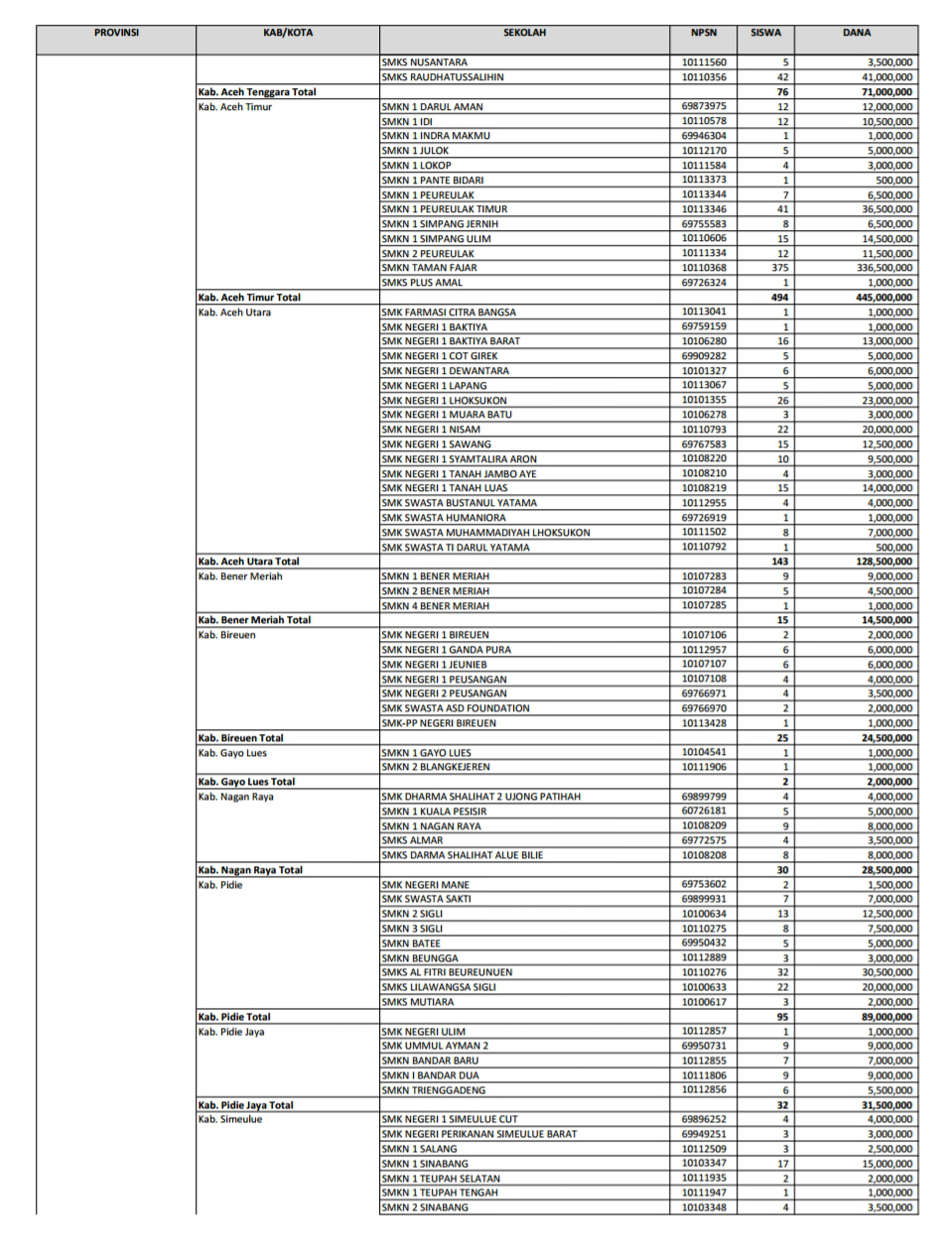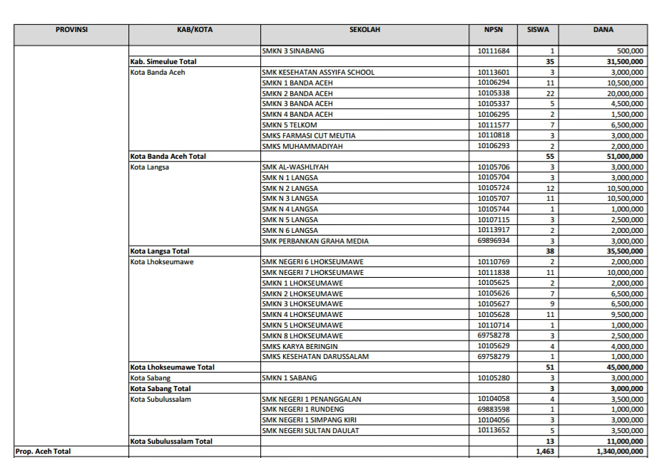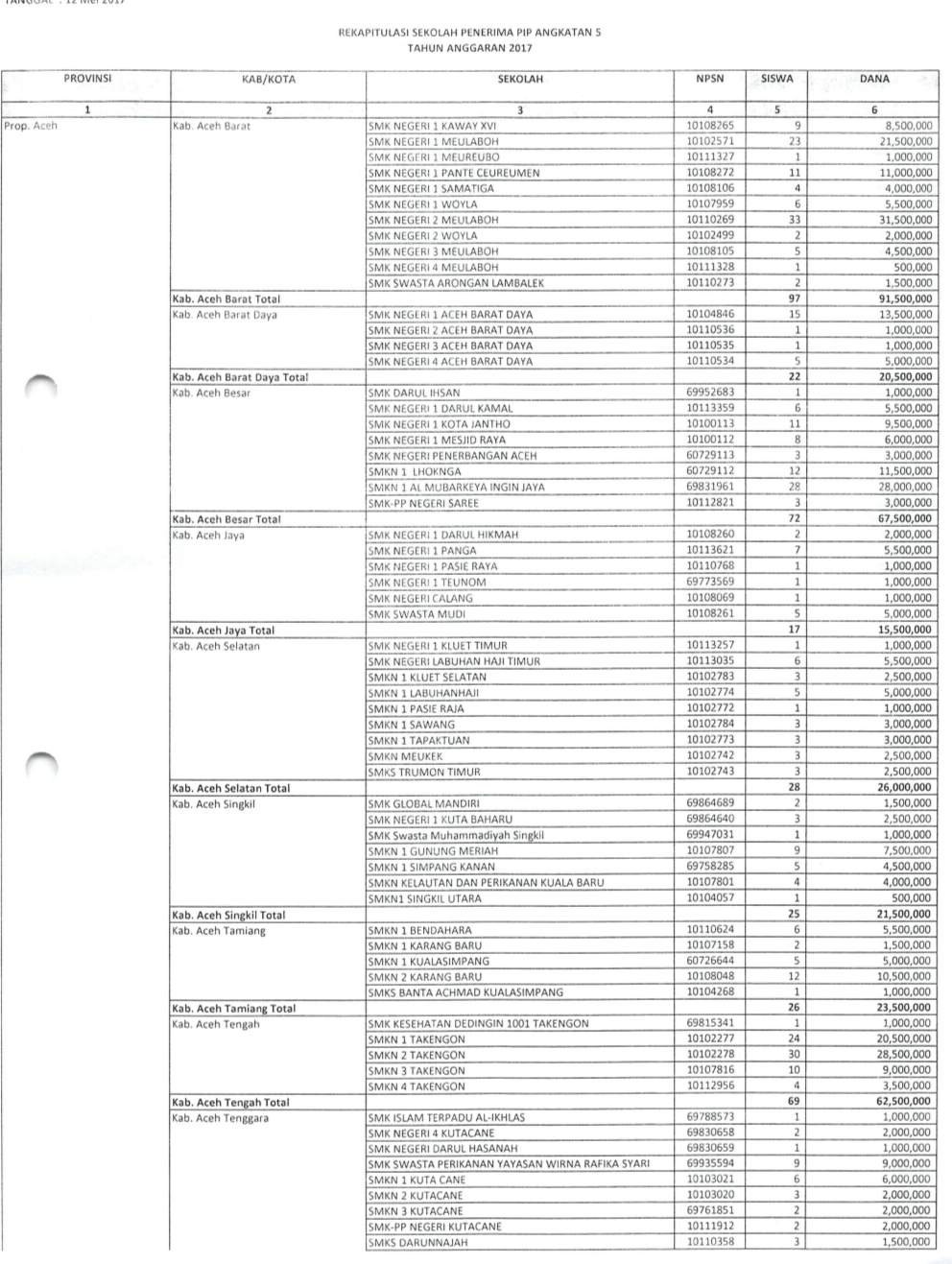 Jaringanpelajaraceh.com- Penetapan alokasi sekolah penerima PIP telah ditetap oleh Kemendikbud melalui surat keputusannya beberapa waktu yang lalu. Aceh mendapat jatah sebanyak 1.3 milyard rupaih yang tersebar di jenjang SMK di 23 Kota.