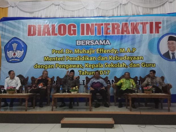 jaringanpelajaraceh.com-Menteri Pendidikan dan Kebudayaan (Mendikbud), Muhadjir Effendy, menyampaikan bahwa Kementerian Pendidikan dan Kebudayaan (Kemendikbud) terus berupaya mewujudkan nawacita di bidang pendidikan. Hal ini disampaikan pada Dialog Interaktif Mendikbud dengan Pengawas, Kepala Sekolah, dan Guru, di Lembaga Penjaminan Mutu Pendidikan (LPMP) Provinsi Kalimantan Selatan, Kamis malam (14/9).