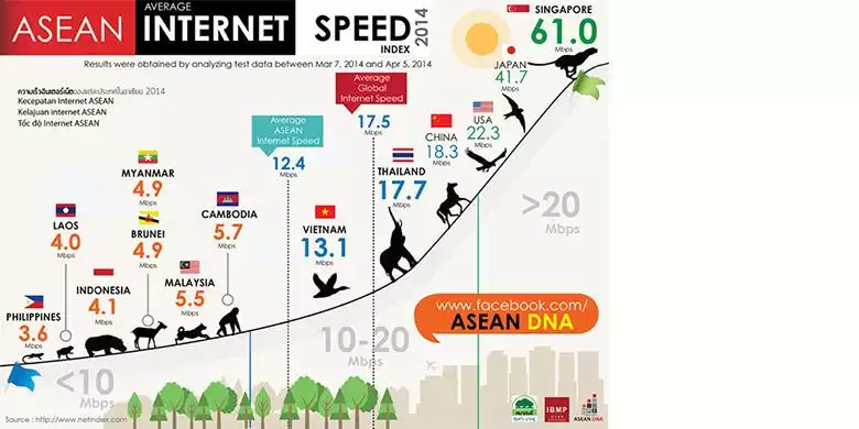 Data tersebut dirangkum dan diolah menjadi infografik oleh ASEAN DNA, sebagaimana bisa dilihat pada gambar di bawah. Dari grafik, kecepatan internet Indonesia digambarkan sebagai kuda nil dan Singapura yang terkencang digambarkan seperti cheetah.