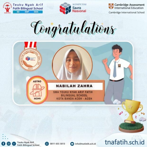 Banda Aceh – Nabilah Zahra, siswi SMA Teuku Nyak Arif Fatih Billingual School Banda Aceh berhasil meraih medali perunggu pada bidang lomba ilmu Astronomi di ajang Kompetisi Sains Nasional (KSN) tingkat nasional tahun 2021 yang diadakan secara daring hingga Sabtu (13/11/2021) di Jakarta.