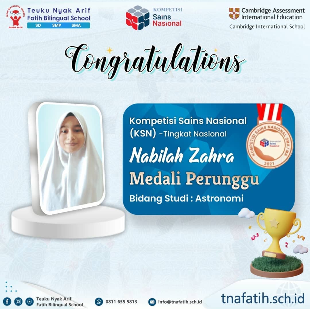 Banda Aceh – Nabilah Zahra, siswi SMA Teuku Nyak Arif Fatih Billingual School Banda Aceh berhasil meraih medali perunggu pada bidang lomba ilmu Astronomi di ajang Kompetisi Sains Nasional (KSN) tingkat nasional tahun 2021 yang diadakan secara daring hingga Sabtu (13/11/2021) di Jakarta.