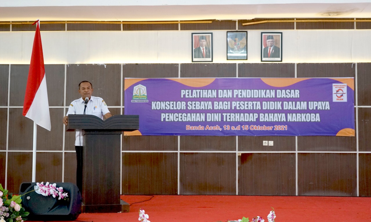 Kepala Dinas Pendidikan Aceh, Drs. Alhudri, MM diwakili Kepala UPTD Balai Tekkomdik, T. Fariyal, MM saat membuka pelatihan dan pendidikan dasar konselor sebaya bagi peserta didik dalam upaya pencegahan dini terhadap bahaya narkoba di Aula Kantor Cabang Disdik Wilayah Kota Banda Aceh dan Kabupaten Aceh Besar, Rabu (13/10/2021).