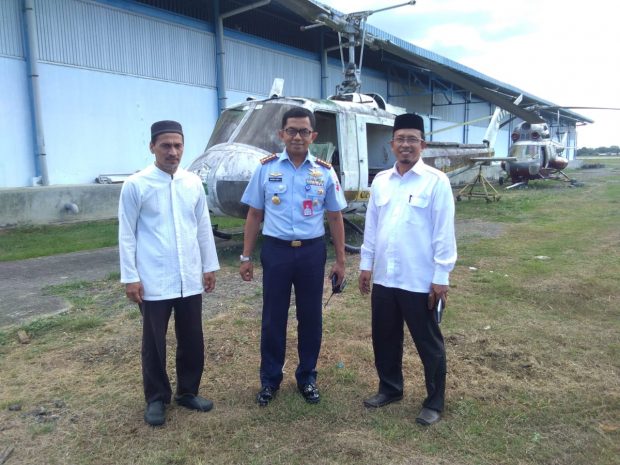 Danlanud SIM Kolonel Pnb. Hendro Arief Herianto, S.Sos (Tengah) dan Kepala SMKN Penerbangan Aceh Baihaqi, S.Pd, M.Pd (Kanan) saat meninjau Helicopter Cempala Kuneng di Komplek Lanud Iskandar Muda Blang Bintang Kabupaten Aceh Besar, (12/2/2020)