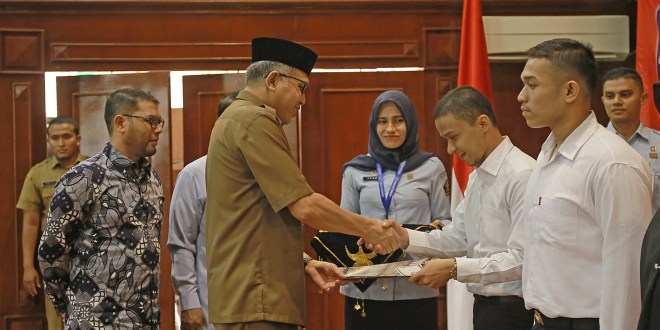 Banda Aceh – Wakil Gubernur Aceh Nova Iriansyah menghadiri penyerahan SK CPNS Kanwil Kementerian Hukum dan HAM Aceh di Anjong Mon Mata, Banda Aceh, Senin 22 Januari 2018.