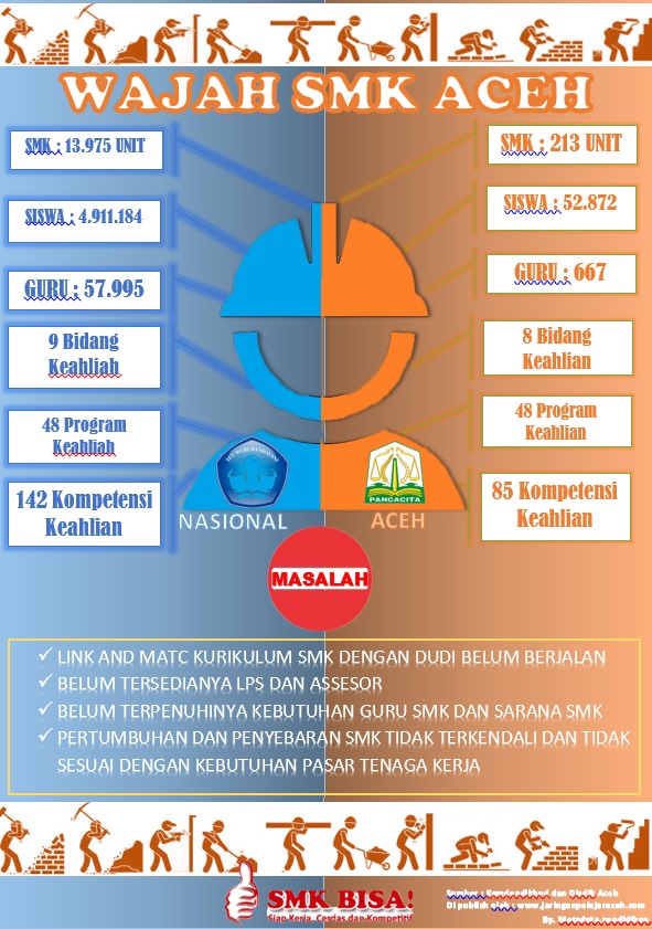Berbagai program telah di rumuskan oleh pemerintah pusat dan Pemerintah Aceh untuk kembali memvitalisasi peran SMK, mulai dari program keahlian ganda hingga modifikasi kurikulum di tingkat sekolah. Semoga usaha ini mendapat dukungan dari Dunia Usaha dan Industri sebagai user lulusan SMK. untuk lebih mengenal Wajah SMK kita, berikut metadata jaringanpelajaraceh.com menyajikan beberapa informasi tentang kondisi SMK kita saat ini. semoga bermanfaat.